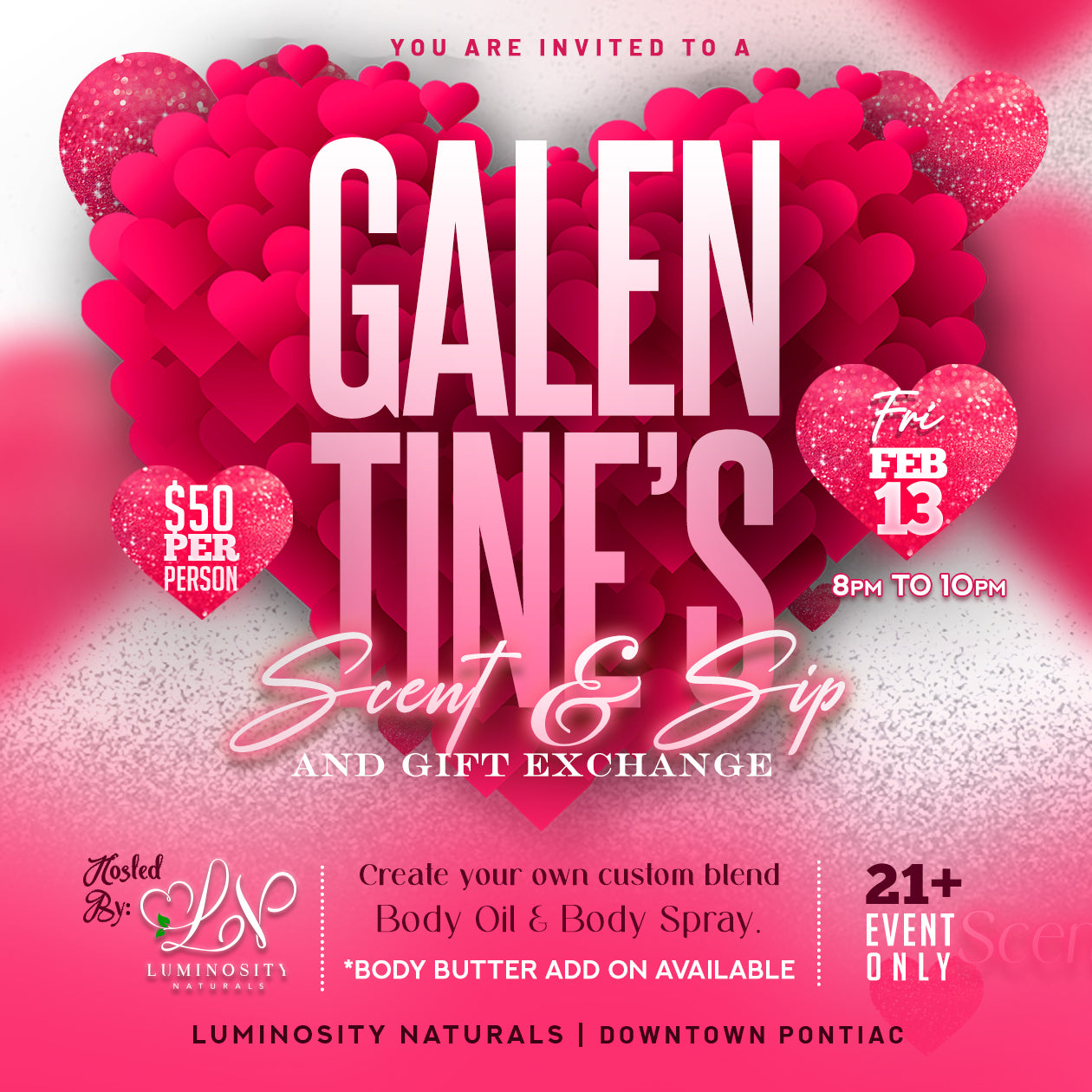 Come create a custom scent and sip, with us! 💖 In this exciting workshop, you’ll create your own scented 4oz body oil and body spray with Luminosity Naturals. You’ll also have the option to add our Whipped Body Butter to create your own custom scent. All while singing some of your favorite songs playing Karaoke trivia! And that’s not all!
